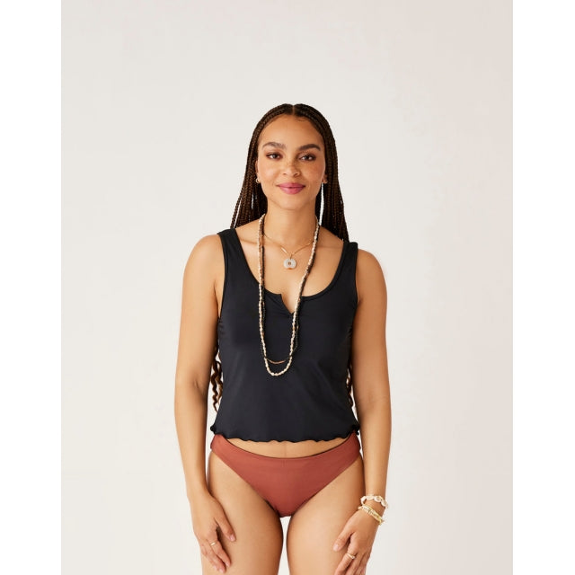 Business on top and party on the bottom is a recipe for success and the Vida Notchneck Tankini is no exception, with its merrow hem detail, floating shelf bra with removable pads.